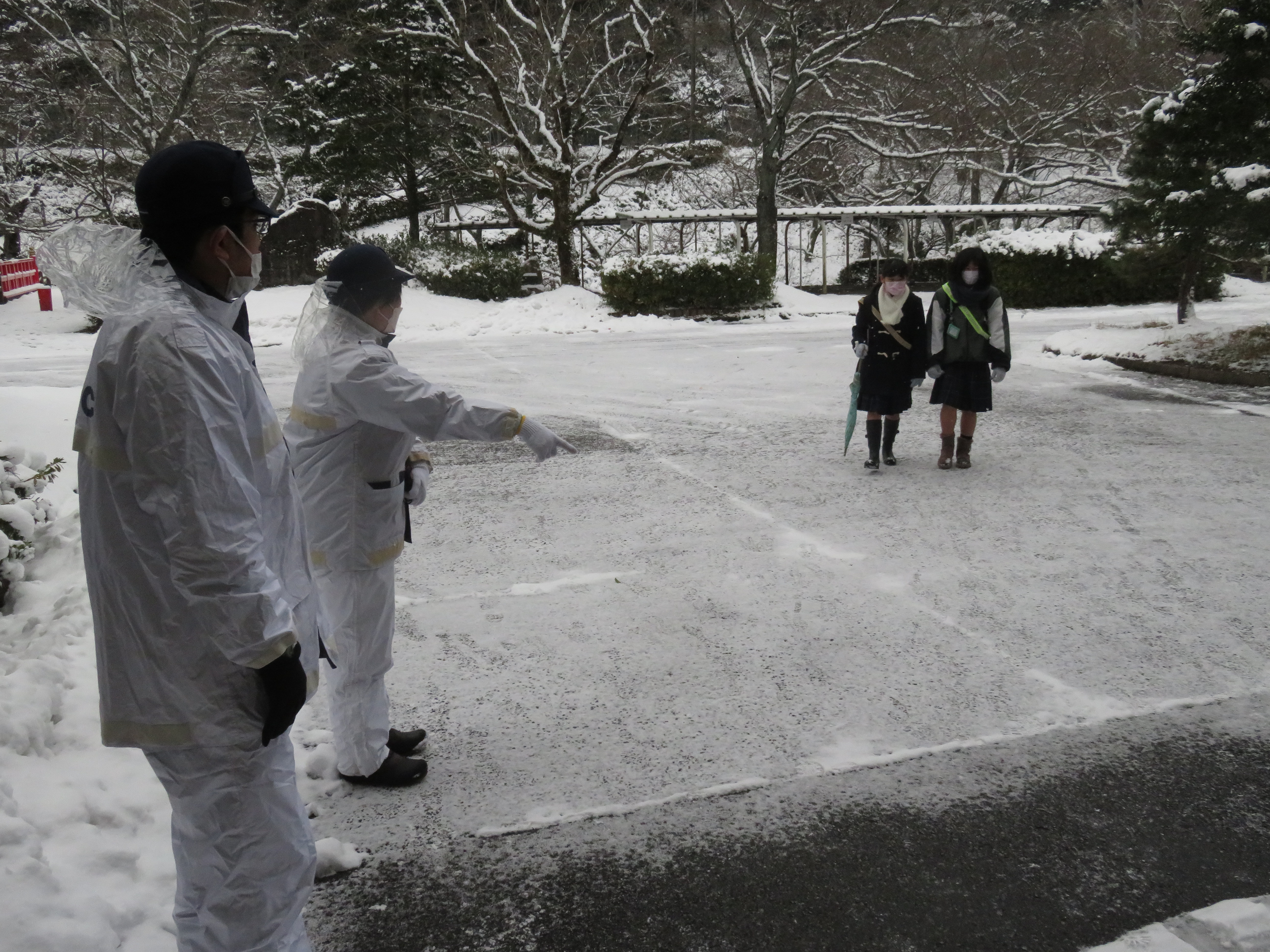 12月19日(月)今朝は今年一番の寒さとなり、平地にも積雪がみられました。多くの児童生徒が登校する時刻に合わせ、朝早くから浜村警察署の方が2名、王舎城学舎児童生徒玄関前で「あいさつ運動」をしてくださいました。足元に気をつけるよう促しながら、一人一人に声をかけておられ、「進んであいさつをする児童生徒さんが多いですね。」とうれしい感想をいただきました。